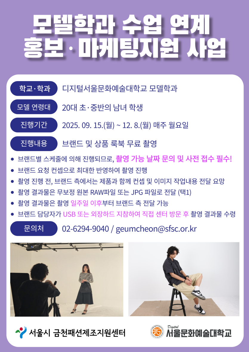 서울시 금천패션제조지원센터에서 디지털서울문화예술대학교 모델학과와 협력하여 2025년도 하반기 <모델학과 수업 연계 홍보·마케팅 지원사업>을 시행하고자 합니다.