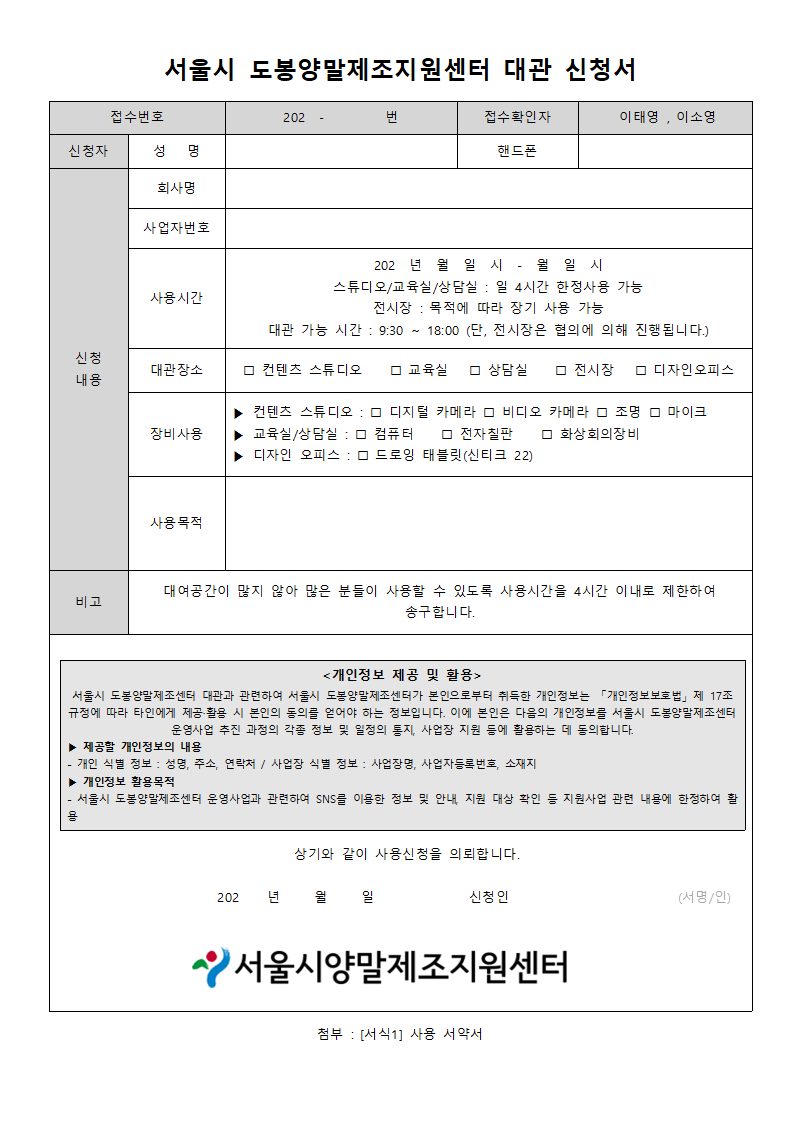 1. 대관 신청 시 연락처를 기재하지 않으면 신청이 취소되는 점 양해 바랍니다.
