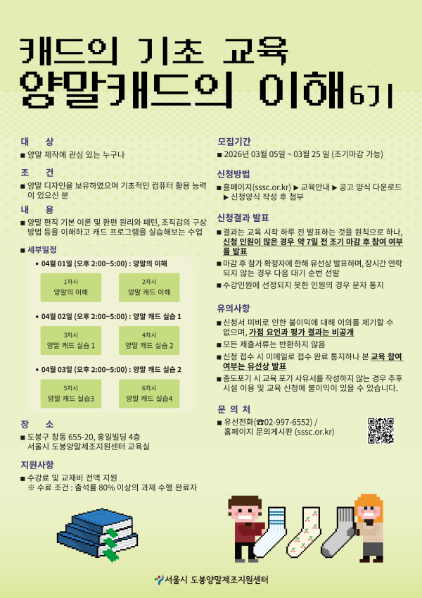 - 조건 : 양말 디자인을 보유하였으며 기초적인 컴퓨터 활용 능력이 있으신 분