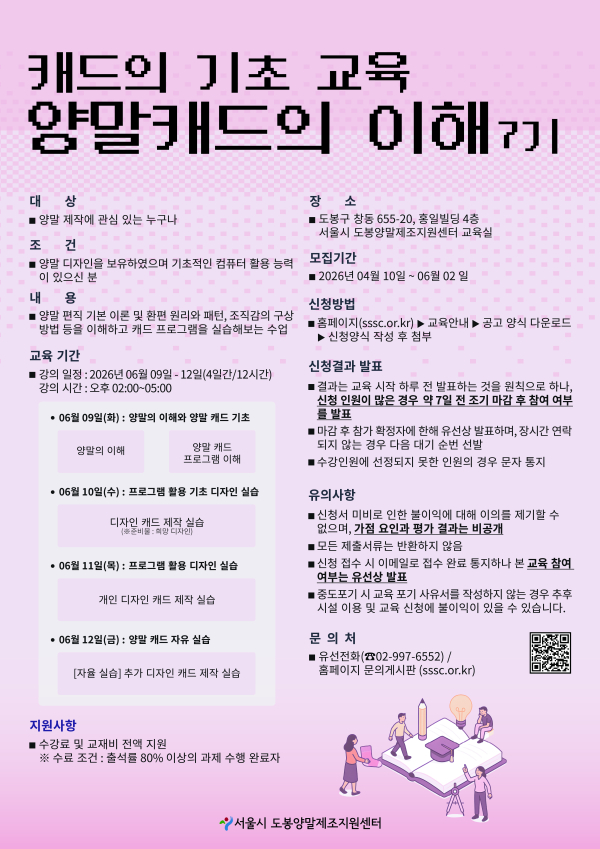 □ 장소 : 서울시 도봉구 창동 655-20, 4층 서울시 도봉양말제조지원센터 교육실 (4호선 쌍문역 2번 출구 50m 앞 홍일빌딩)