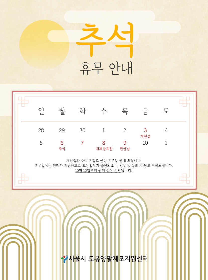 공휴일으로 인해 10월03일부터 10월 9일까지 휴관 합니다